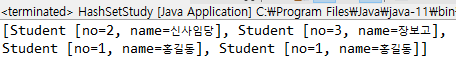 다음과 같다. no=1, name=홍길동은 Set에서 같다고 판단하지 않은 것이다.