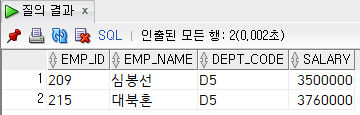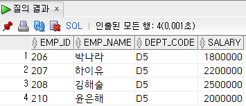 -- 부서코드가 D5인 사원 조회 (사번, 사원명, 부서코드, 급여)