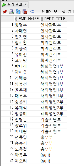 마케팅부, 국내영업부, 해외영업 3부가 null값을 가짐에도 출력된 것을 확인할 수 있다.