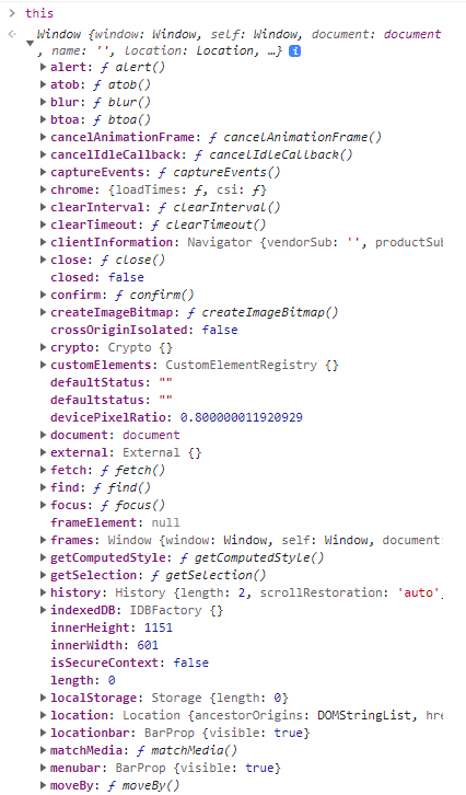 F12콘솔창에 this를 검색하면, 다음과 같이 window 가 가진 객체들이 뜬다.