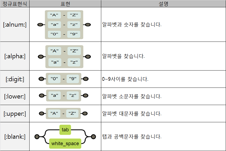 하나의 문자에 대한 값목록(순서상관없음), 범위(아스키코드(유니코드)작은순-큰순) [abc] [김이]