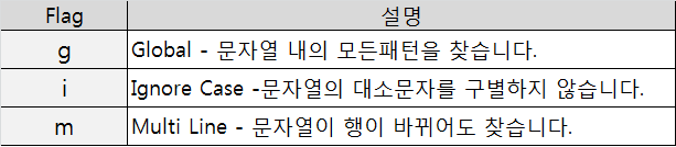 - i ignoreCase : 영문자에 한해 대소문자 구분하지 않고 처리