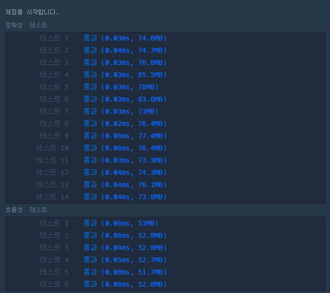 조건이 자연수 1000000이하여서 그런지, 효율성 테스트도 통과했습니다!